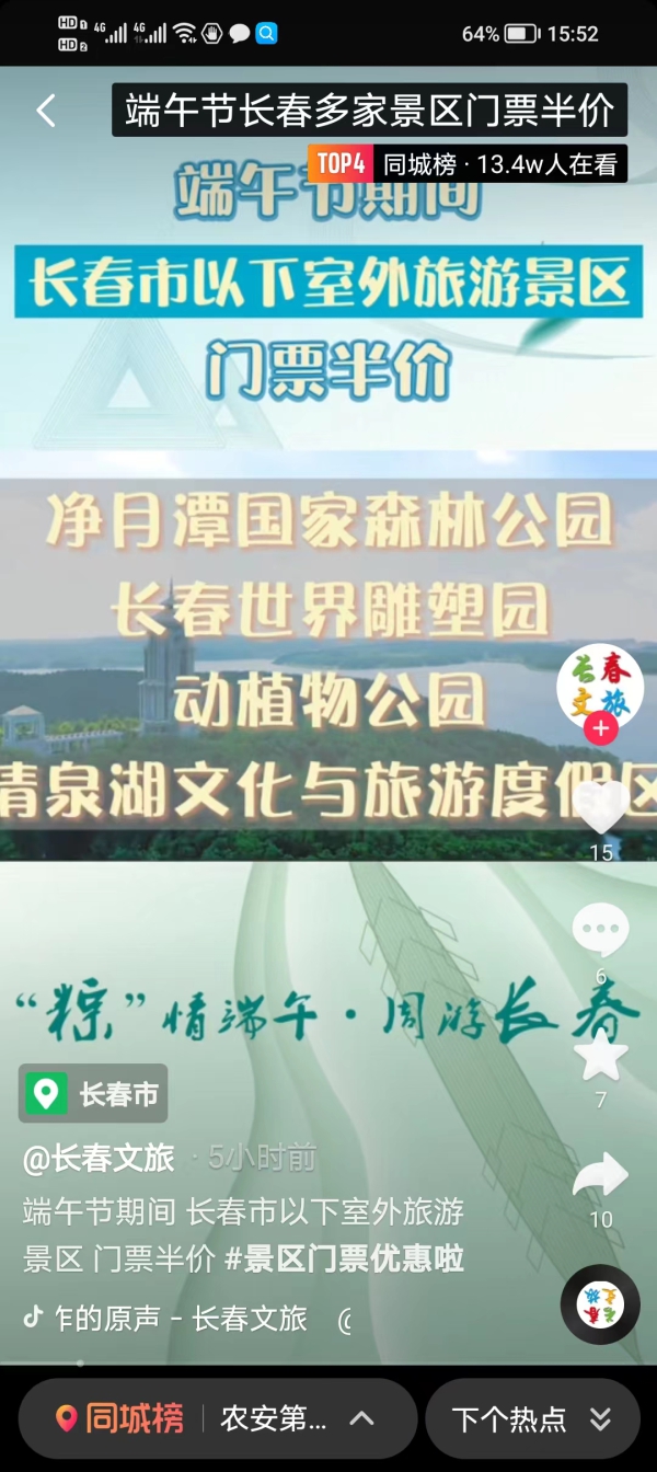还有一个关于端午节的“好消息”和咱们吉林网友分享:端午节期间,净月潭国家森林公园、长春世界雕塑园等长春多家景区门票半价了。