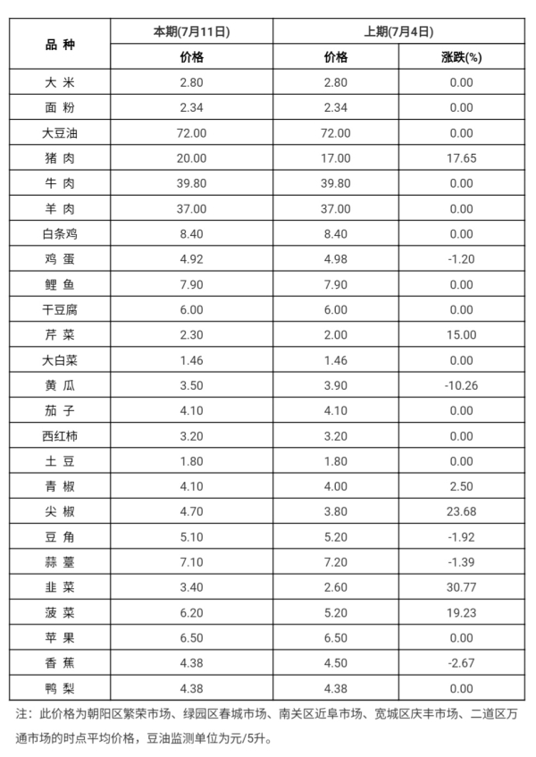 中国吉林网从长春市发改委获悉,据五大农贸市场监测数据显示,长春市重要生活必需品市场货源储备充足、流通渠道基本畅通,完全可以满足市民的消费需求。今日(7月11日)与上周一(7月4日)相比,粮油和水果价格平稳,猪肉价格上涨,其他副食品价格稳中略降,蔬菜价格有涨有落。