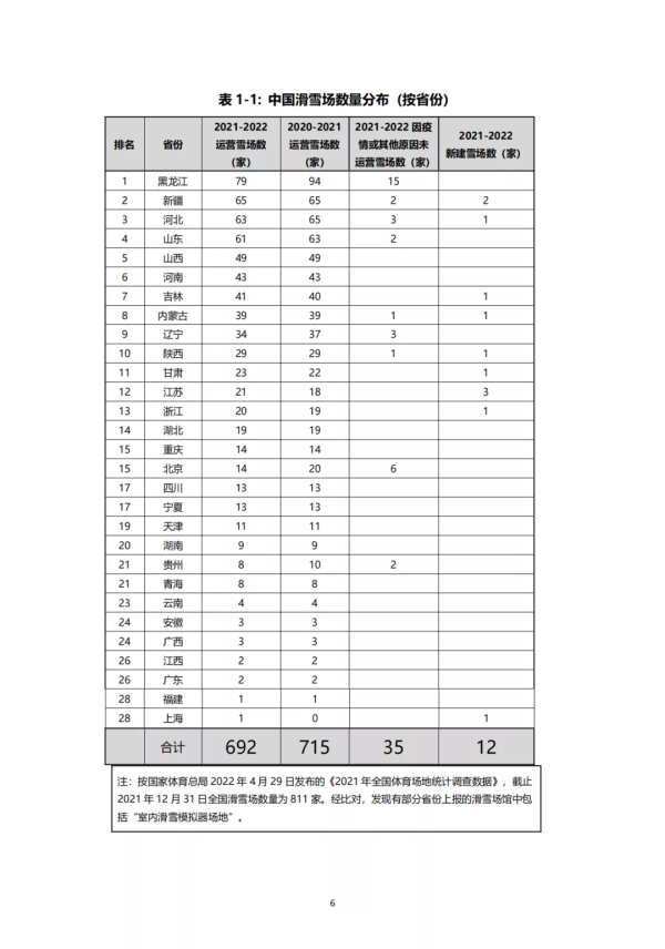 据“白皮书”统计,2021-2022雪季财年处于营业或间歇性营业的滑雪场总数为692家。其中,吉林省41家,排名全国第七。与去年相比,新建雪场1家。