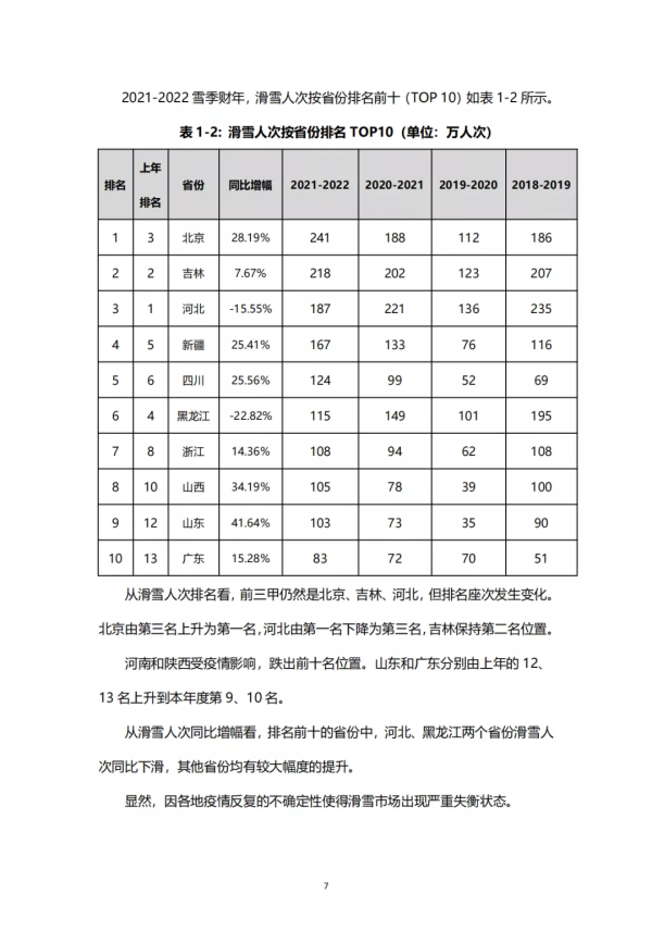 在滑雪人次按省份排名TOP10中,吉林高居全国第二。即便受到疫情影响,吉林同比增幅也达到了7.67%,连续三年呈现上升趋势。