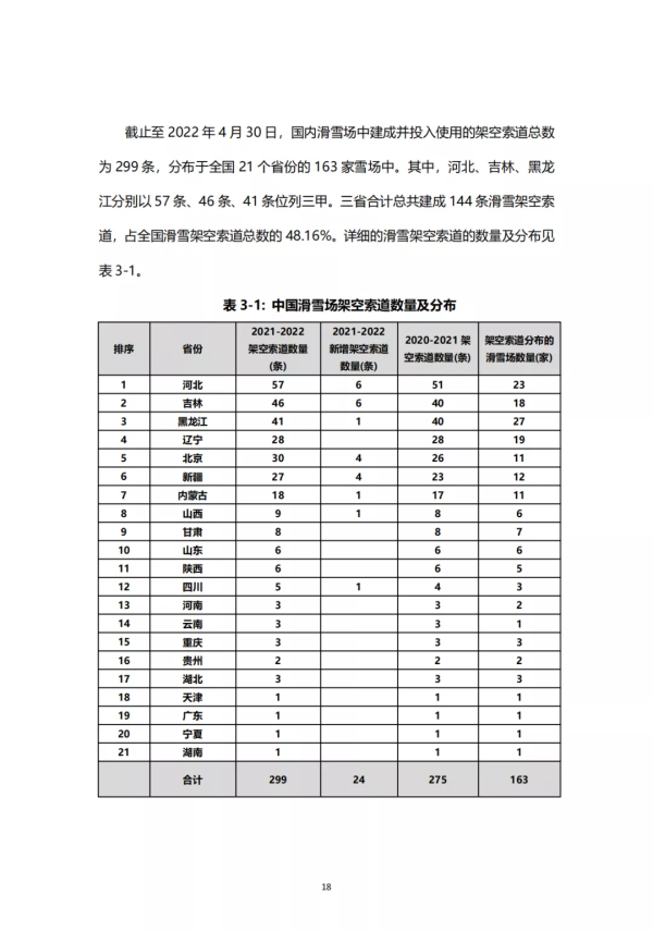 “白皮书”数据显示,截止至2022年4月30日,国内滑雪场中建成并投入使用的架空索道总数为299条,分布于全国21个省份的163家雪场中。其中,河北、吉林、黑龙江分别以57条、46条、41条位列三甲,三省合计总共建成144条滑雪架空索道,占全国滑雪架空索道总数的 48.16%。