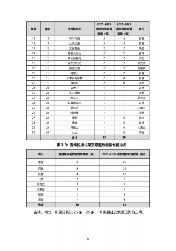 另外在雪场脱挂式架空索道数量排名上,吉林以8家雪场26条高居全国榜首,身后为河北和新疆。