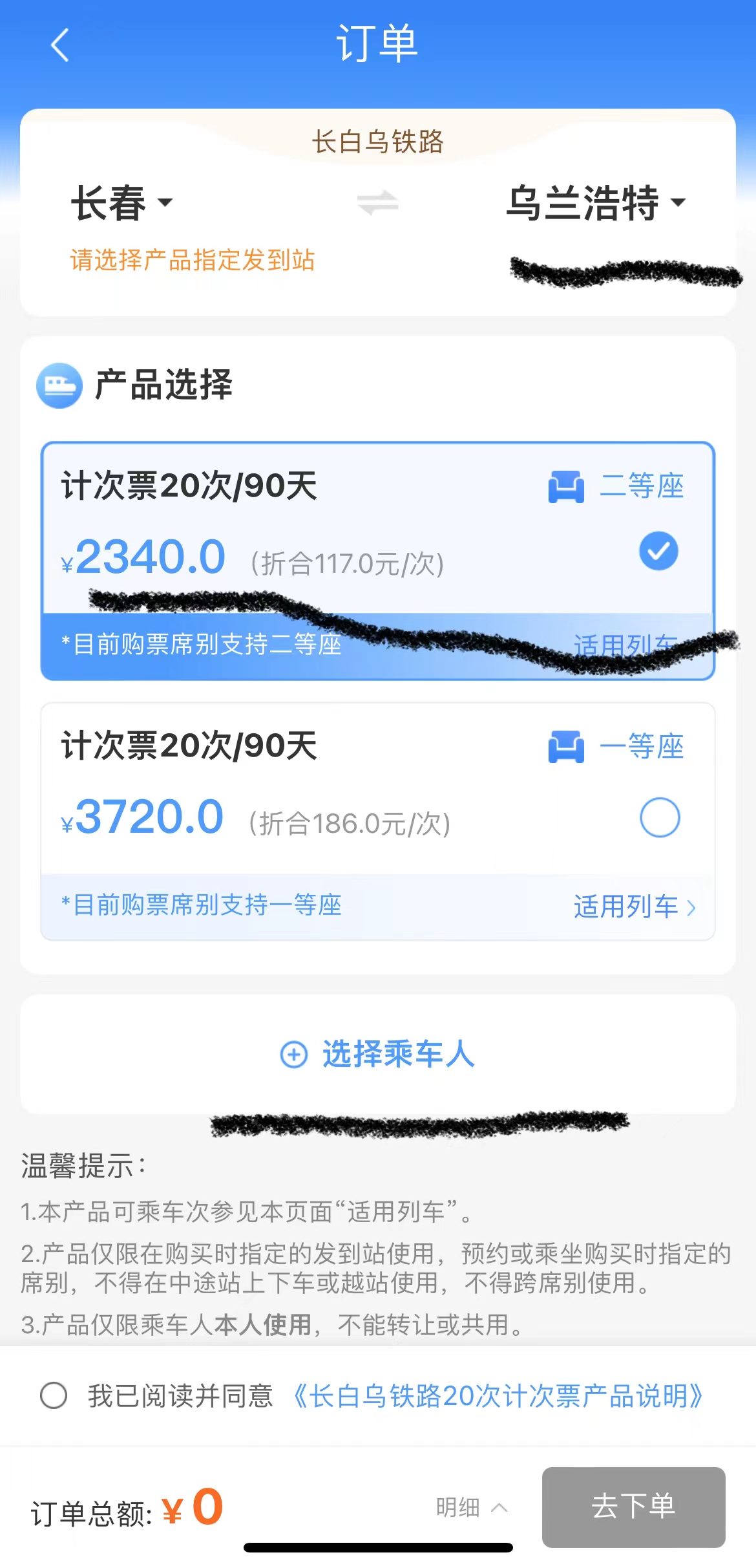 点击“去下单”后,就能够根据选择从车站看到价格。本计次票限定为长白乌铁路内下列车站作为出发站或到达站的往返固定组合:长春、农安、王府、松原、查干湖、大安、安广、白城、乌兰浩特。