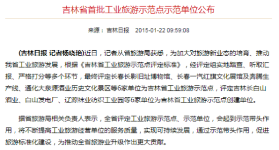 早在2015年,吉林省12家单位获评首批工业旅游示范点及示范点创建单位,其中评定长春长影旧址博物馆、长春一汽红旗文化展馆及奔腾生产线、通化大泉源酒业历史文化景区等6家单位吉林省工业旅游示范点。