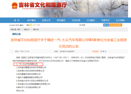 2021年,吉林省文化和旅游厅确定一汽-大众汽车有限公司等8家单位为全省工业旅游示范点。