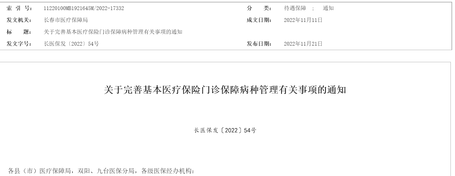 日前,长春市医疗保障局发布《关于完善基本医疗保险门诊保障病种管理有关事项的通知》。本通知明确了病种范围将于2023年1月1日开始实施。