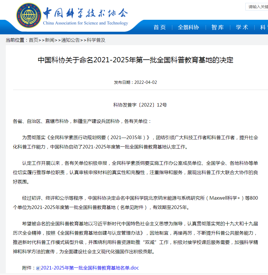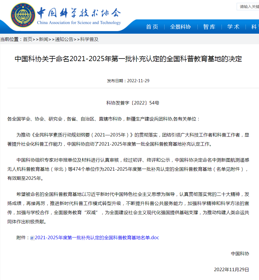 为贯彻落实《全民科学素质行动规划纲要(2021—2035年)》,团结引领广大科技工作者和科普工作者,提升社会化科普工作能力,中国科协启动了2021-2025年度第一批全国科普教育基地认定工作。2022年5月,中国科协公布了2021-2025年第一批全国科普教育基地名单,吉林省科技馆、长春中国光学科学技术馆、吉林市博物馆、集安市科学技术馆等吉林省13家单位光荣上榜。