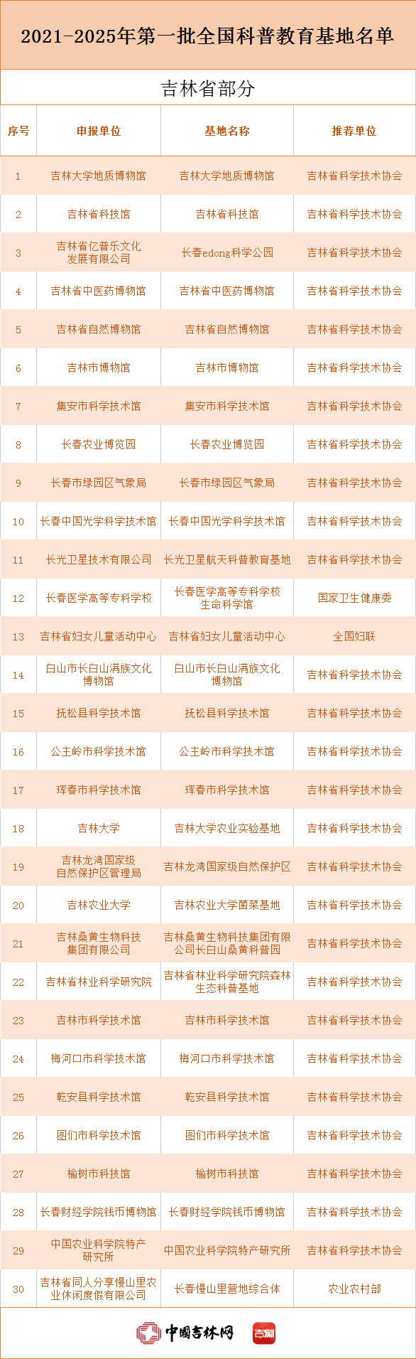 最后,我们来看一下2021-2025年度第一批全国科普教育基地吉林省部分的名单和其中5家入选单位的相关介绍。