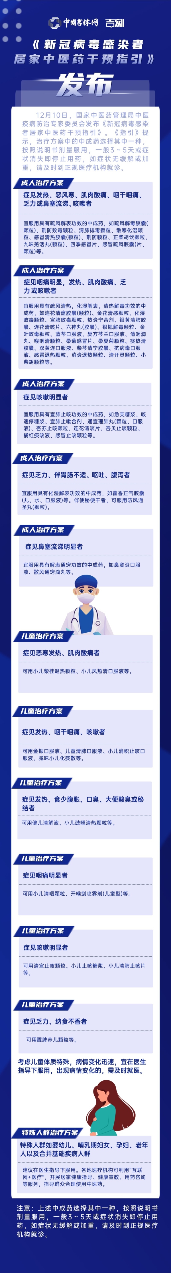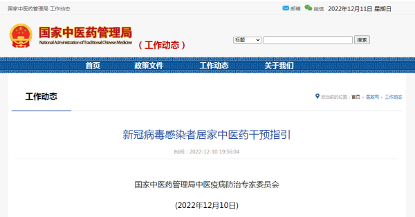据国家中医药管理局网站消息,12月10日,国家中医药管理局中医疫病防治专家委员会发布《新冠病毒感染者居家中医药干预指引》(以下简称《指引》)。