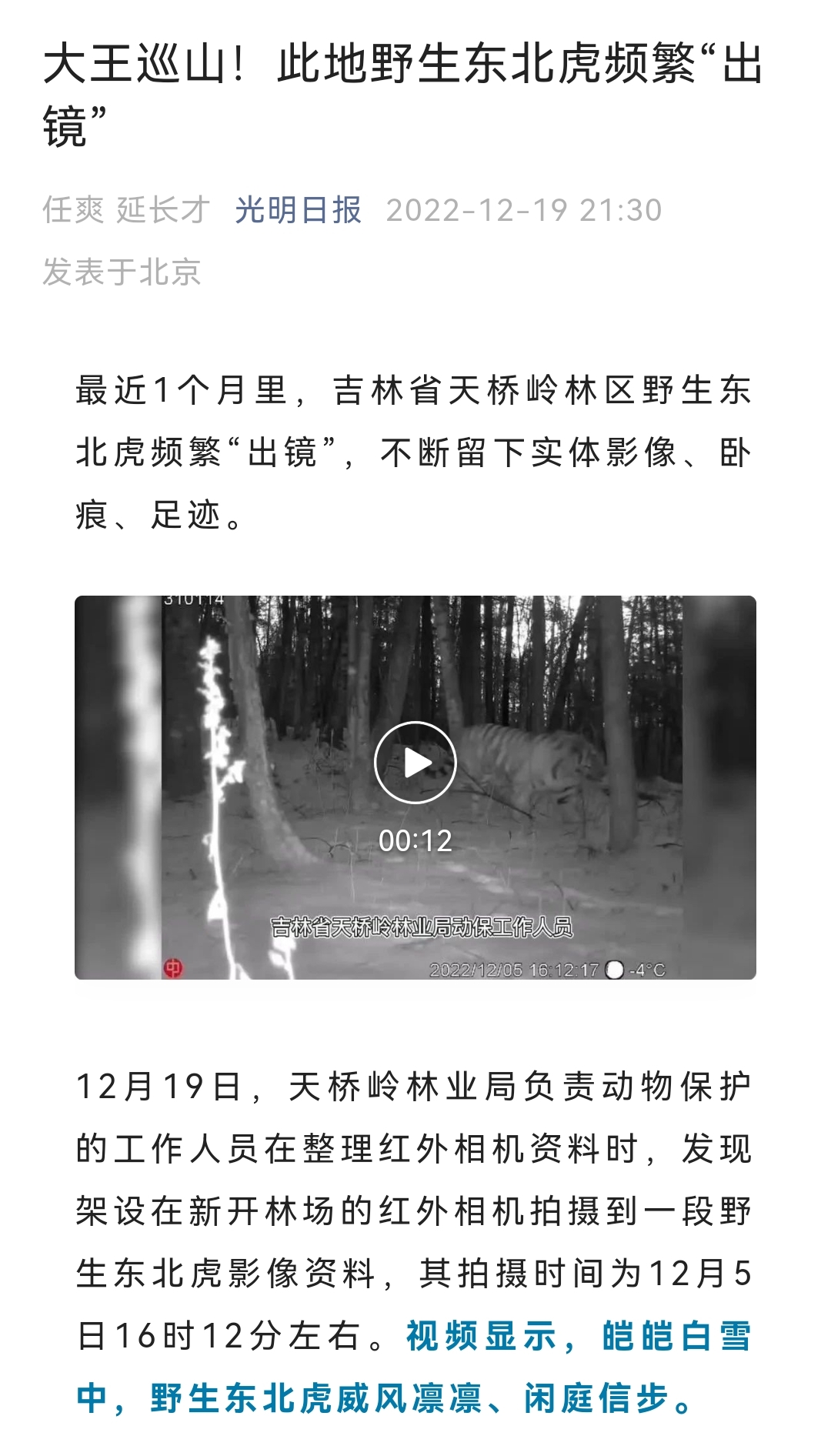 报道中提到,12月19日,天桥岭林业局负责动物保护的工作人员在整理红外相机资料时,发现架设在新开林场的红外相机拍摄到一段野生东北虎影像资料,其拍摄时间为12月5日16时12分左右。视频显示,皑皑白雪中,野生东北虎威风凛凛、闲庭信步。