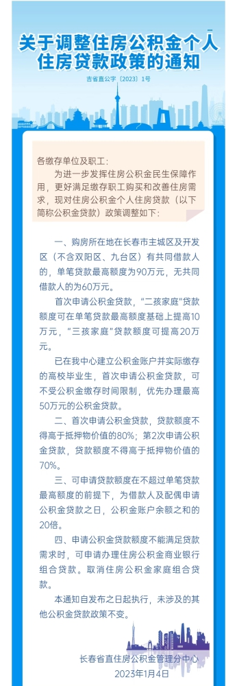 中国吉林网获悉,日前,长春省直住房公积金管理分中心发布通知,调整住房公积金个人住房贷款政策。