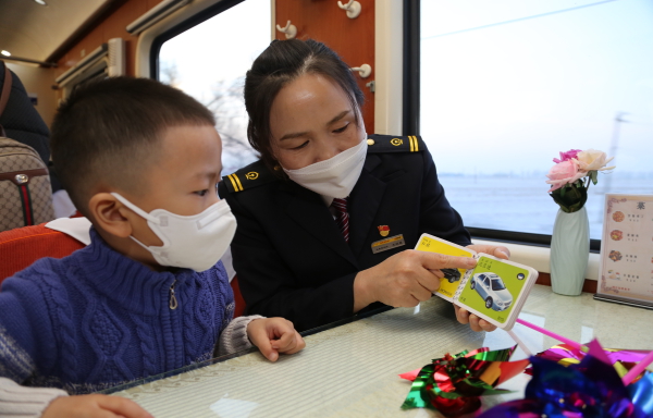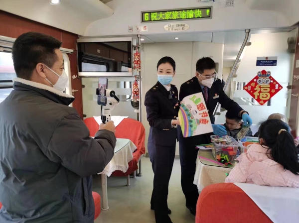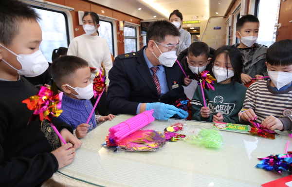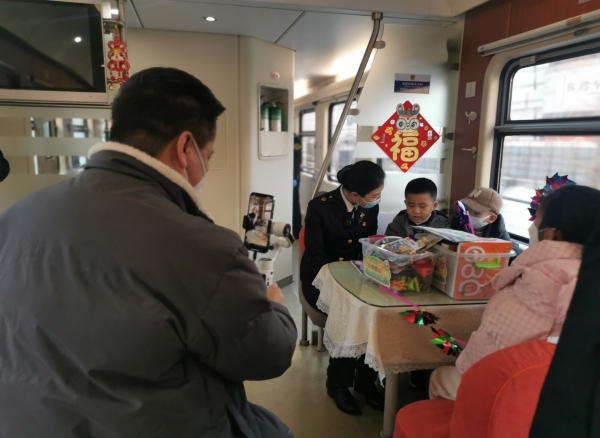 1月7日当天,刘影还直播了列车工作人员为小旅客们准备的精彩的欢迎仪式。与儿童旅客开展了互动安全知识问答,为小旅客介绍沿途风光及历史文化,一起学唱《列车幼儿园安全教育拍手歌》。“风车舅舅”党员列车员赫军自己利用业余时间制作了五彩风车,赠送给当天乘车的儿童做为乘车纪念,让小旅客们开心不已。