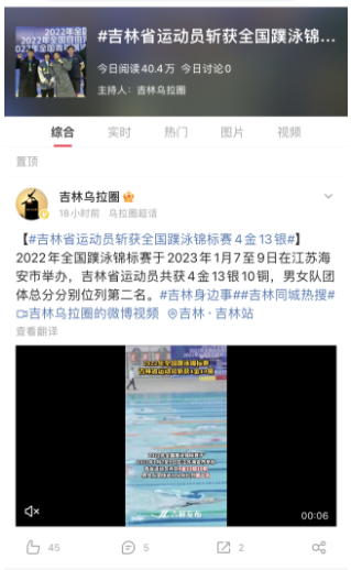 2022年全国蹼泳锦标赛于2023年1月7至9日在江苏海安市举办,吉林省运动员共获4金13银10铜,男女队团体总分分别位列第二名。