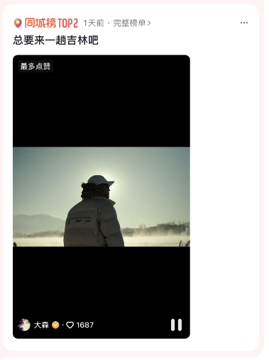 近日,由网友拍摄的《总要来一趟吉林吧》短视频作品获得大量点赞,截至目前,已位于抖音同城榜TOP2!