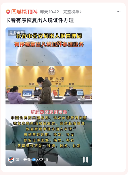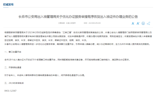 根据国家移民管理局关于2023年1月8日起新型冠状病毒感染“乙类乙管”后优化移民管理政策措施的公告,长春公安出入境管理部门按照国家移民管理局以及省厅出入境管理局相关要求有序恢复受理审批中国公民因出国旅游、访友申请普通护照,恢复办理内地居民旅游、商务赴港签注;恢复受理审批外国人申请普通签证延期、换发、补发,停留证件签发、换发、补发,居留证件签发、延期、换发、补发。