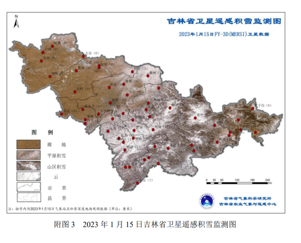 积雪覆盖较多。截至1月15日,全省积雪覆盖率约为67.14%。积雪主要分布长春北部及东部、辽源、吉林、通化、白山、延边及长白山保护区。