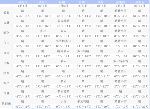 4日,长春市天空晴朗,最高气温-5℃左右,最低气温-14℃;5日,长春市为多云天气,最高气温-2℃。