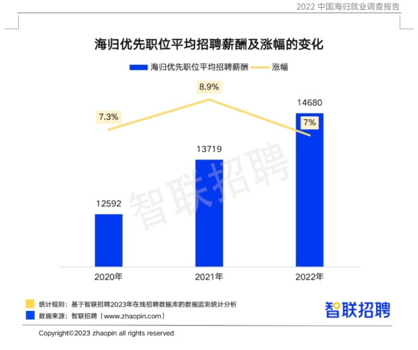 从薪酬看,海归优先职位的平均招聘薪酬连续三年走高,2022年达14680元/月,比2021年的13719元/月增加961元,增长7%。随着海归职位结构的优化,海归优先职位平均招聘薪酬也在逐年提升。
