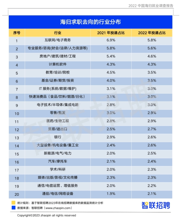 行业方面,2022年向互联网/电子商务行业和专业服务/咨询行业投递的海归占比最高,分别为5.8%、5.6%,排名与2021年保持一致。这表明,IT和专业服务领域对留学生的就业吸附能力依然很强。