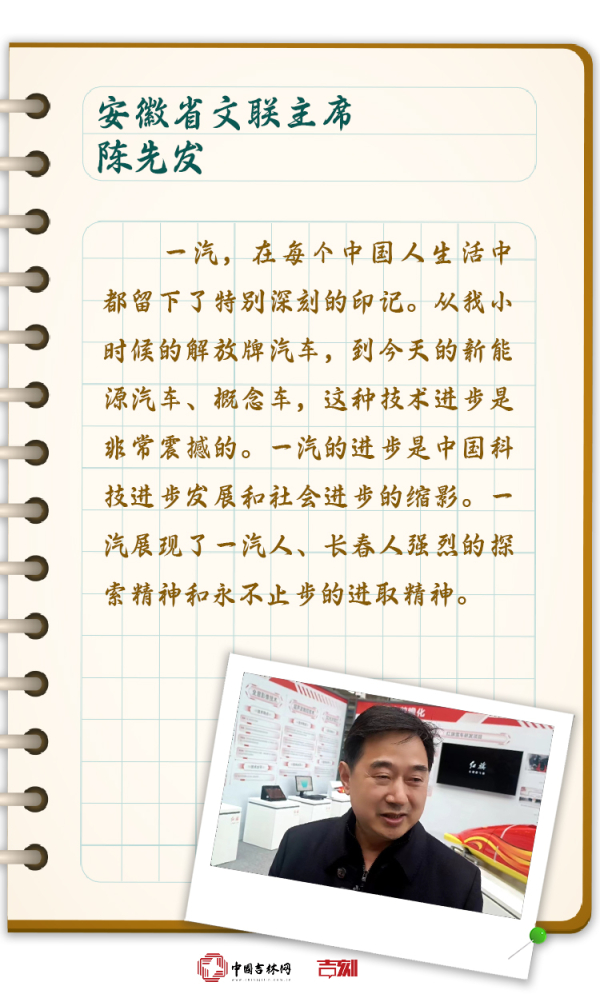 安徽省文联主席陈先发:一汽,在每个中国人生活中都留下了特别深刻的印记。从我小时候的解放牌汽车,到今天的新能源汽车、概念车,这种技术进步是非常震撼的。一汽的进步是中国科技进步发展和社会进步的缩影。一汽展现了一汽人、长春人强烈的探索精神和永不止步的进取精神。