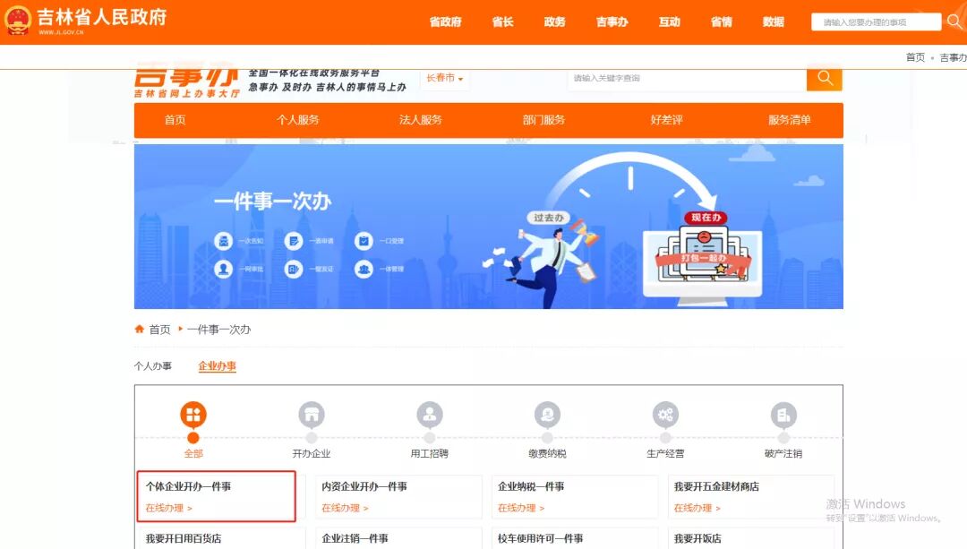 广大办事群众可在吉林省网上办事大厅“一件事一次办”专区一次性申请办理个体工商户设立登记、发票票种核定、存款账户账号报告等业务,各相关部门通过信息共享,实现“减环节、减时间、减材料、减跑动”。办事群众只需一次性在线提交所需资料,即可完成“个体企业开办一件事”相关事宜。