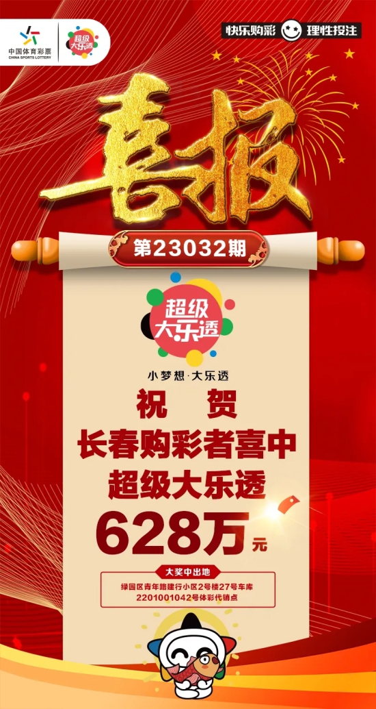 吉林省的中奖幸运地位于长春市绿园区青年路建行小区2号楼27号车库的2201001042号体彩代销点。这位幸运的购彩者以"一票10注"长票的投注方式在购买的第5注号码命中大奖,这张投注金额20元的彩票为其带来了6288243元奖金,投注时间为3月25日19时16分。