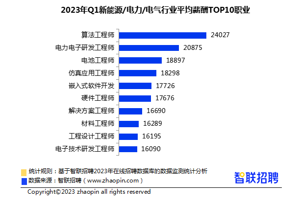 进一步观察新能源行业中的高薪职业,记者发现技术岗位薪资优势突出。2023年一季度,新能源/电力/电气行业中算法工程师岗位薪资居于首位,平均招聘月薪为24027元,电力电子研发工程师招聘薪酬也超过2万元,电池工程师(18897元)、仿真应用工程师(18298元)、嵌入式软件开发(17726元)、硬件工程师(17676元)等人才的薪资水平也领先,解决方案、材料、工程设计、电子技术研发等工程师和研发人员薪酬也明显较高。