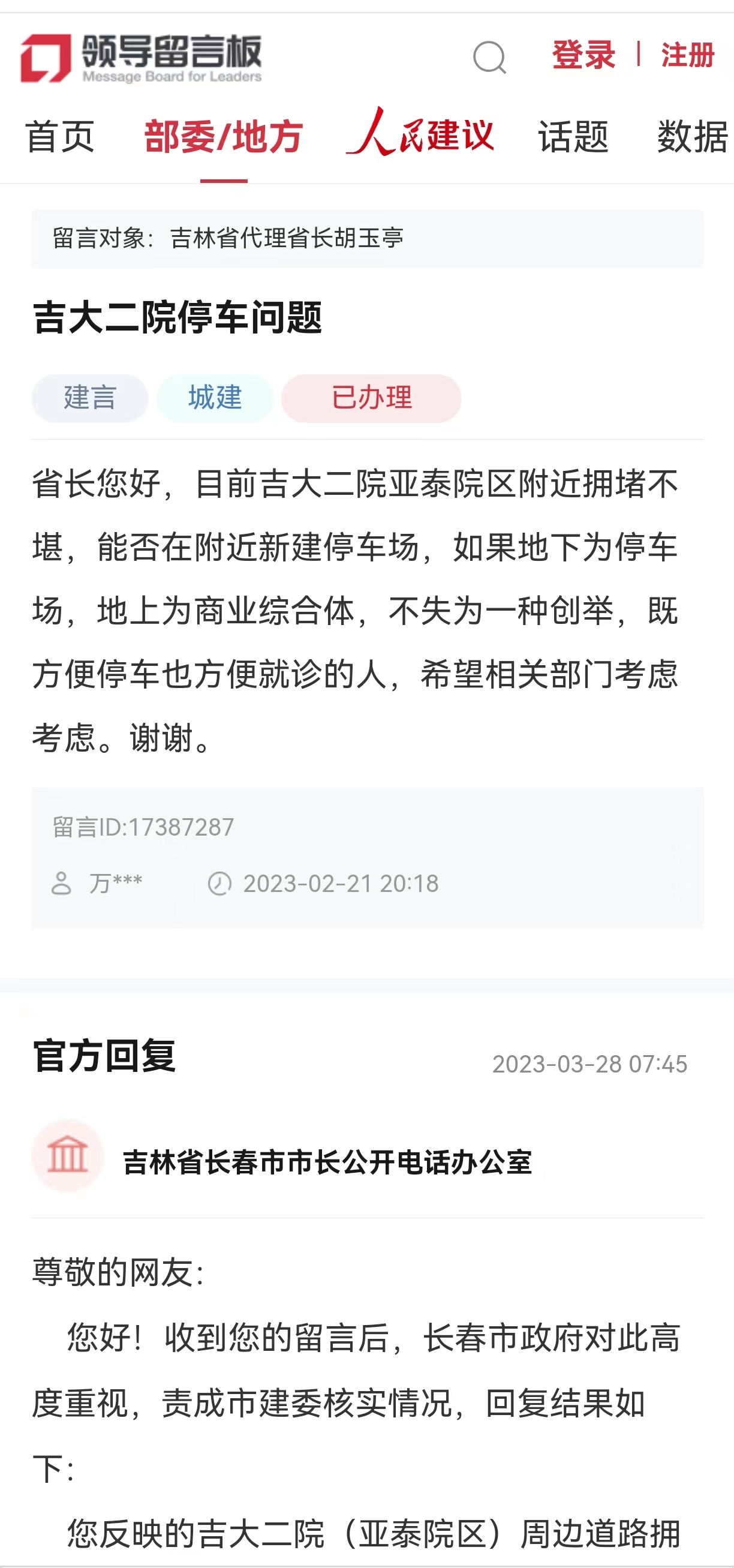 对此,长春市建委核实后回复称, 该名网友所反映的吉大二院(亚泰院区)周边道路拥堵和医院停车泊位有限的问题我们已知悉。对于解决吉大二院(亚泰院区)周边交通问题,市政府高度重视,为畅通百姓就医渠道,目前已谋划并实施了多项交通治理措施,陆续采取了东进西出(东岭街进医院、亚泰大街辅道出医院)缓解亚泰大街交通压力,局部拓宽东岭街、亚泰大街辅道提高通行能力,在东岭街设置隔离护栏,严禁车辆违停、掉头,调整亚泰大街掉头口位置,加强交警执法和疏导,加强周边违停治理,优化地图导航引导等措施。经连续监测,二院周边交通运行状况稳定可控,交通拥堵问题得到有效缓解。