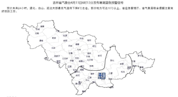 吉林省气象台4月11日6时13分发布寒潮蓝色预警信号:预计未来24小时,通化、白山、延边大部最低气温将下降8℃左右,部分地方可达10℃以上,省应急管理厅、省气象局联合提醒注意做好预防工作。