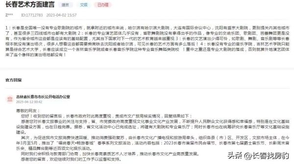 近日,长春市市民提出应该增设专业的大剧院,增添更多艺术活动,4月12日,官方进行了以下回复: