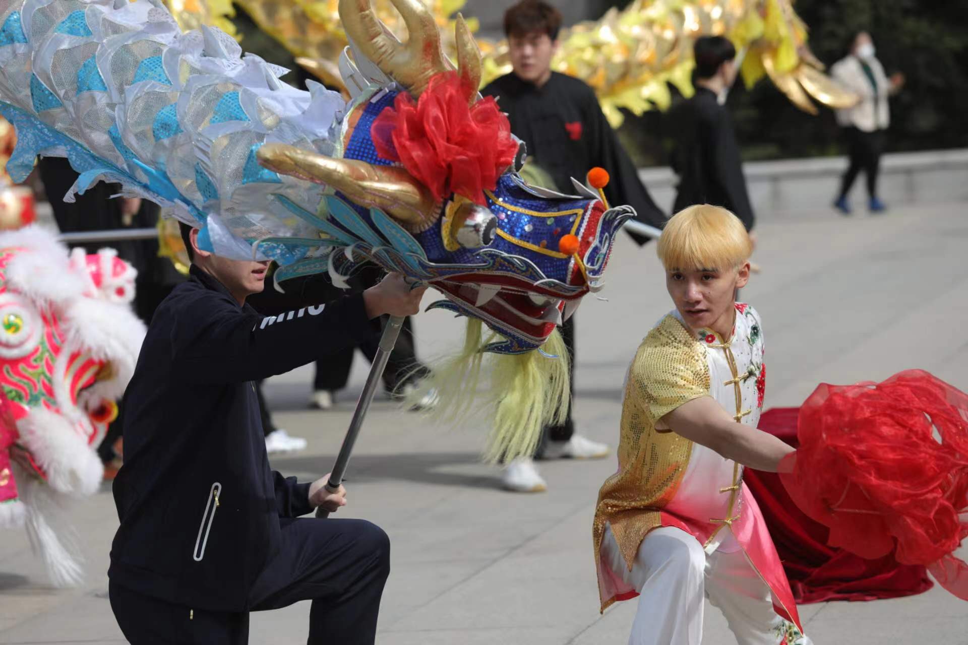 活动现场,锣鼓喧天,狮舞龙腾,气氛热烈,欢乐祥和。威风锣鼓表演气势磅礴、慷慨激昂,舞龙舞狮翻滚穿梭、盘旋腾跃,喜庆热烈。伴着欢快的节奏、动感的舞步,300人大型群众广场舞表演,队员们身着各色健身服,精神抖擞,意气风发,用充满激情的舞蹈展示最美风姿,吸引许多现场观看的群众参与互动,加入到表演中来。