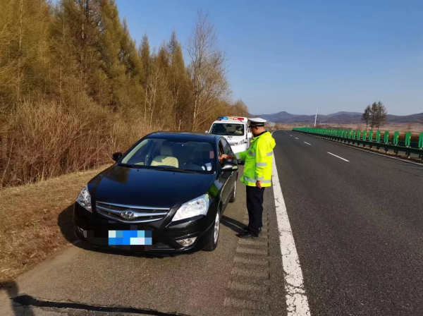 近日,吉林省公安厅高速公路公安局吉林分局巡逻一大队民警巡逻至珲乌高速298公里处时,发现一辆小车开着危险报警闪光灯停在应急车道内,民警立即停好警车做好防护前去查看。