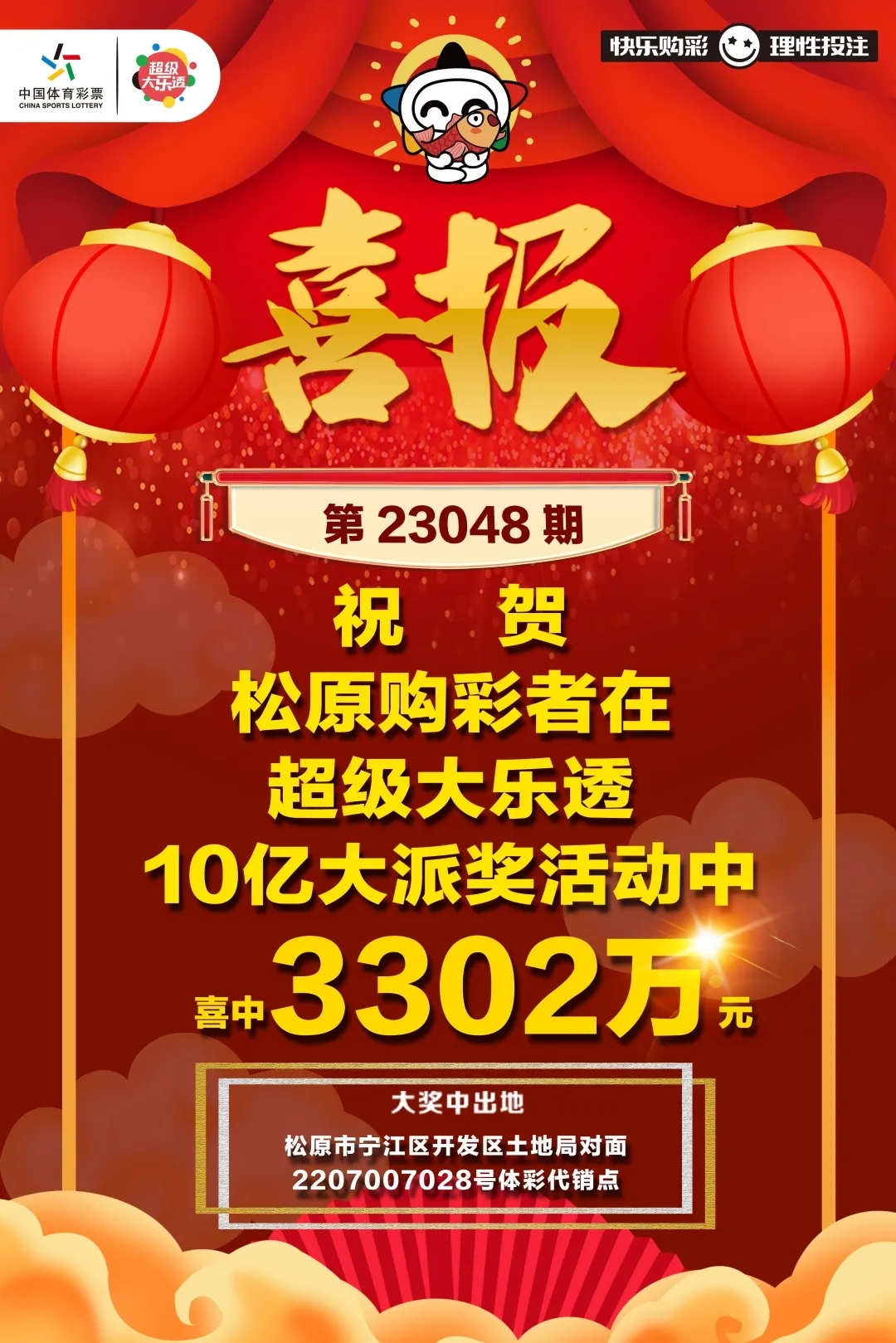 吉林省中出的3299万元追加投注一等奖,出自松原市宁江区开发区土地局对面的2207007028号体彩代销点,这注大奖为10亿元派奖活动中出现的第3个3299万元大奖。中奖彩票为一张“6+2”复式追加多期票,共中出一等奖1注、四等奖5注,单票收获奖金3302万元。