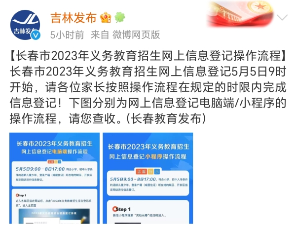 5月5日,长春市2023年义务教育招生网上信息登记开始,请各位家长按照操作流程在规定的时限内完成信息登记!