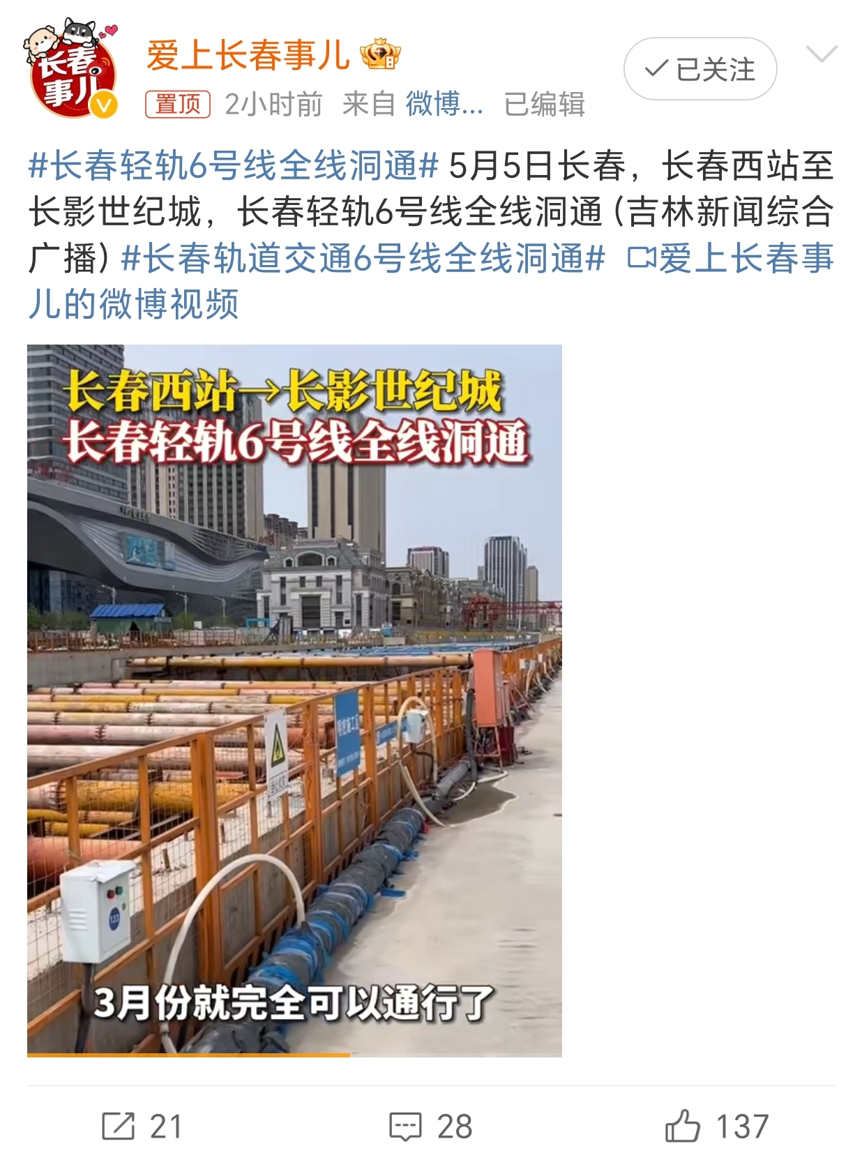 5月5日,长春西站至长影世纪城站,长春轨道交通6号线全线洞通。