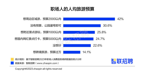 除了跨境游、远距离游,周边游也成为职场人新选项。42%的职场人准备周边游,预算2000元以内,占比排名各种旅游首位。其次是公园遛弯,占比30.6%。也有25.8%的职场人希望在附近景点游玩,预算1000元以内。