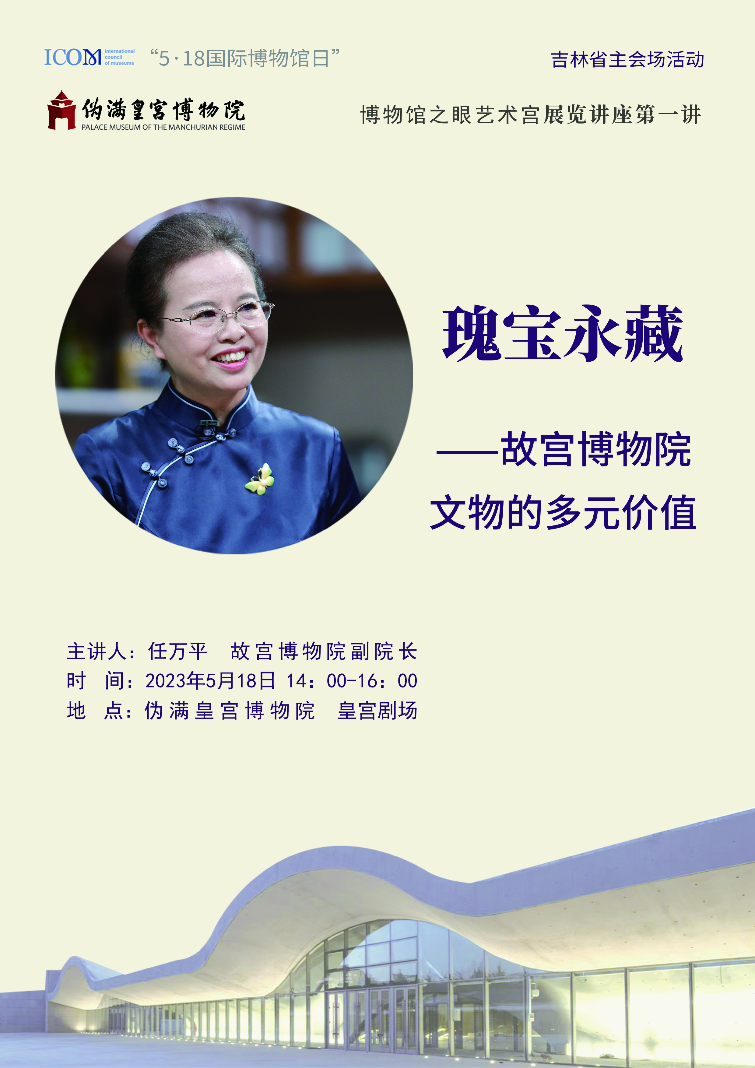 为喜迎2023年国际博物馆日,5月18日14:00-16:00,在伪满皇宫博物院皇宫剧场将举办“伪满皇宫博物院博物馆之眼艺术宫展览讲座”第一讲,邀请故宫博物院副院长任万平带来“瑰宝永藏——故宫博物院文物的多元价值”。