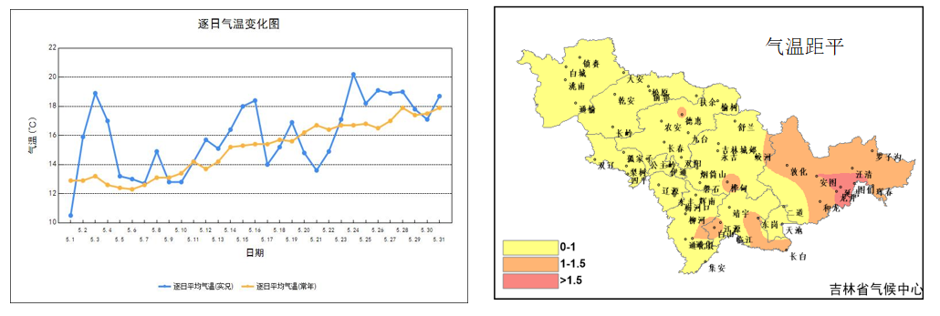 5月全省平均气温为16.0℃,较常年高0.9℃,居历史同期气温偏高第9位,除二道平均气温与常年持平外,全省各县市气温高于常年。
