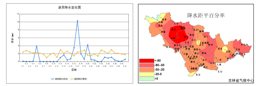 5月我省各市州降水量为11.3~50.7毫米,与常年比,松原和长春较常年少7成,长白山保护区少5成,白城、四平、辽源、吉林、通化、白山和延吉少3~4成。