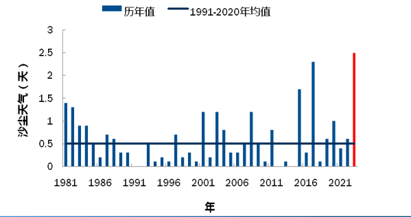 5月沙尘天气偏多,我省平均出现沙尘天气2.5天,较常年多2.0天,居近43年以来沙尘天气偏多第1位。大范围(≥10站)沙尘天气共出现3次,分别为2-3日、21日、24-25日。