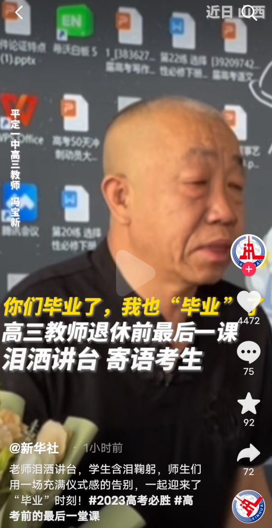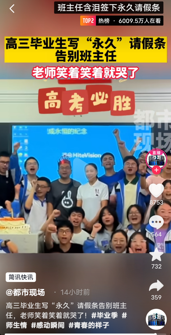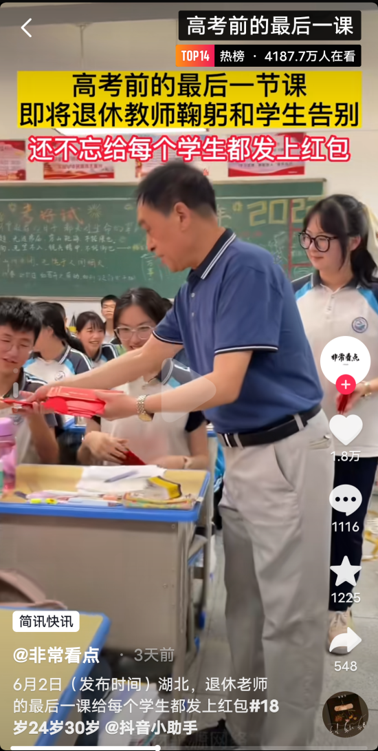 根据新华社报道,一位即将退休的老师,在送走自己执教生涯最后一批高三同学后,自己也将“毕业”。