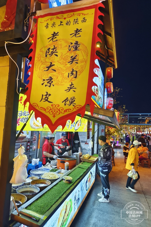 在陕西街上,一面印有“老陕大凉皮 老潼关肉夹馍”的旗帜迎风飘荡,古朴典雅的陕西元素特色店铺吸引着八方来客,这里的凉皮和肉夹馍是街上的大“明星”。