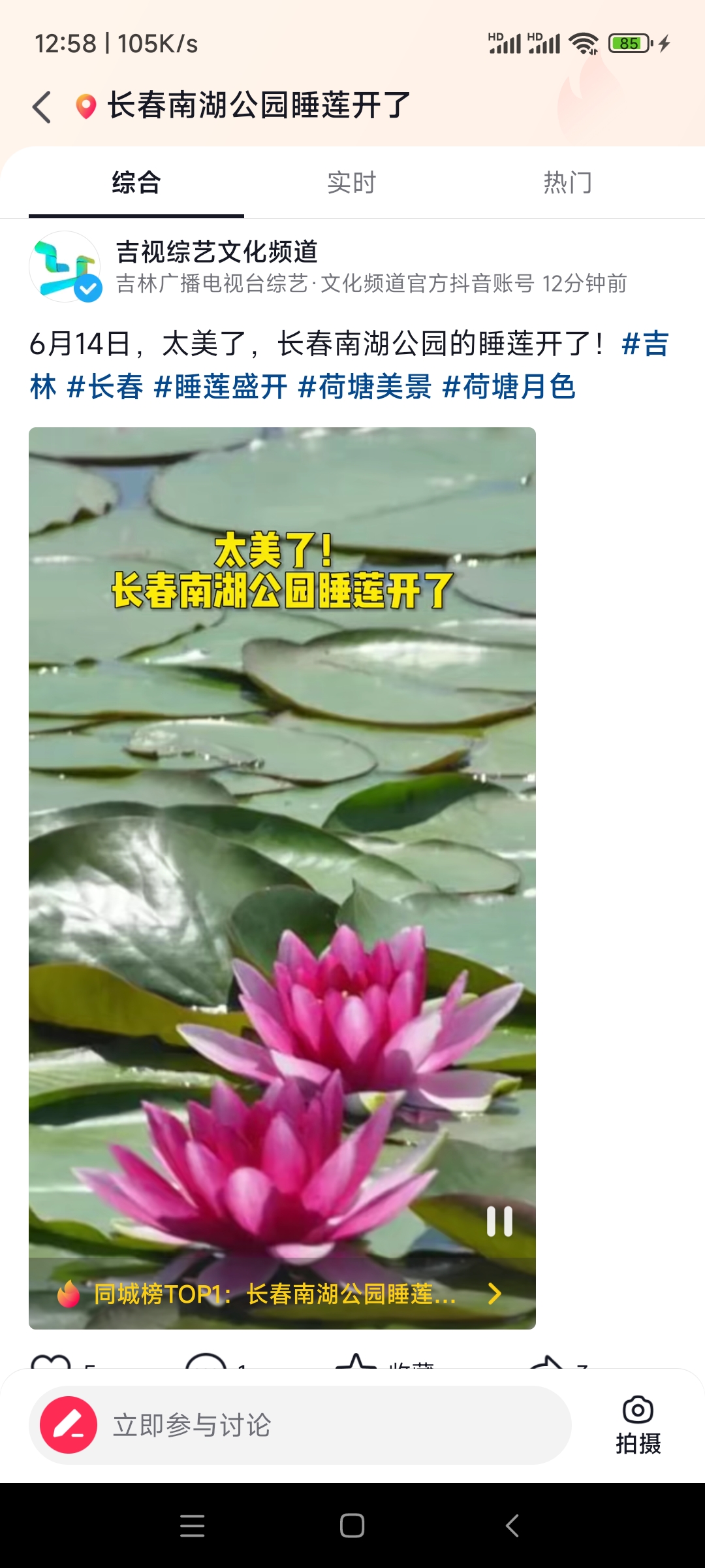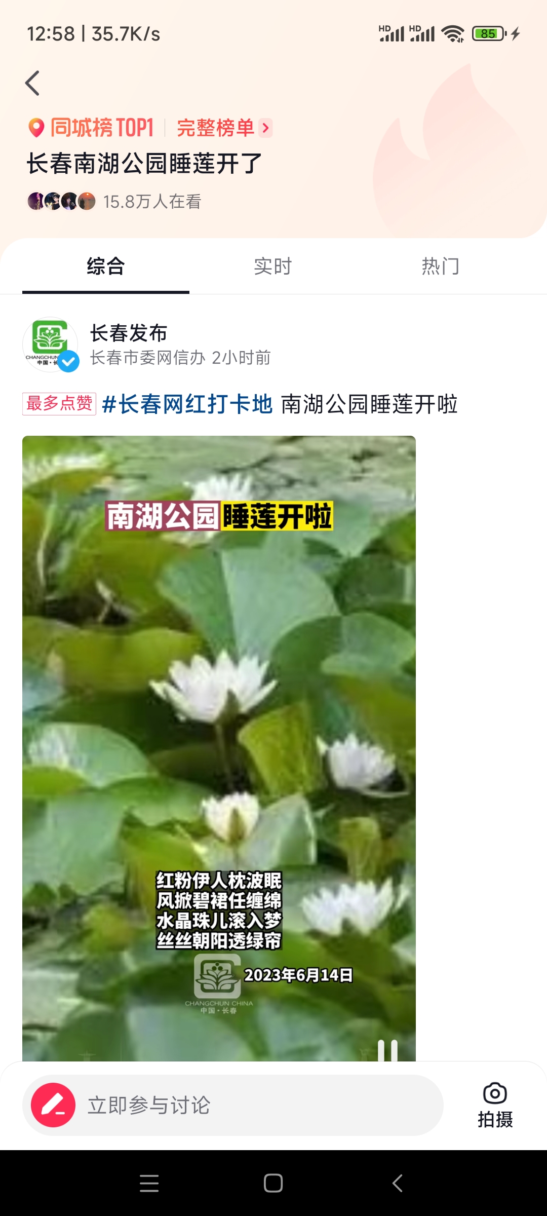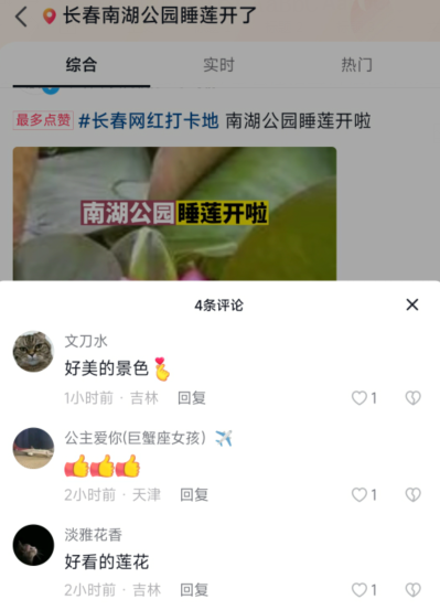 当日长春本地热榜第一名——南湖公园的睡莲开了。