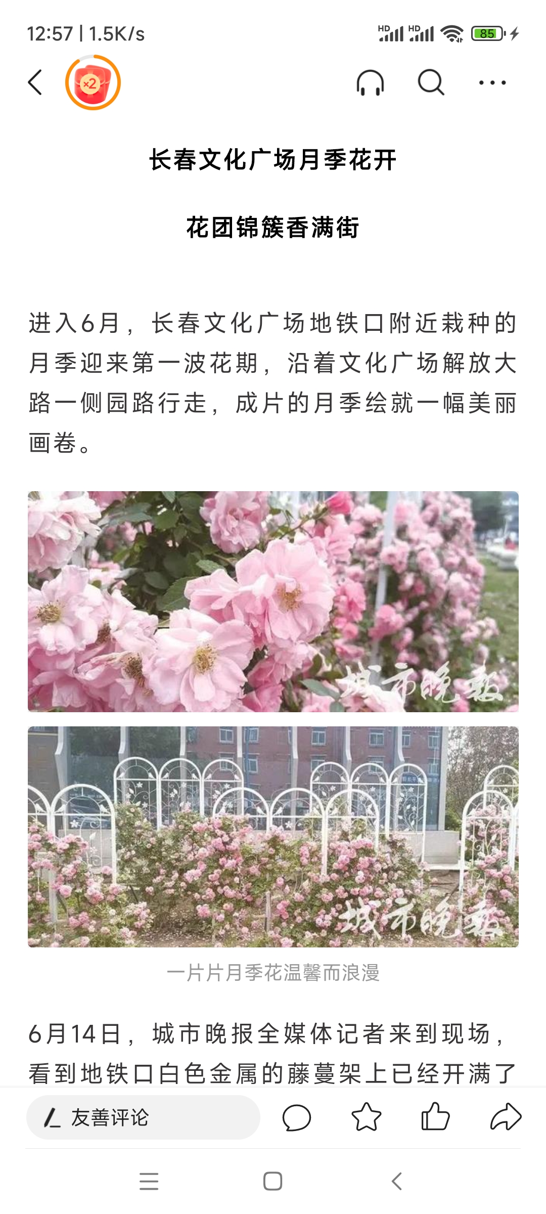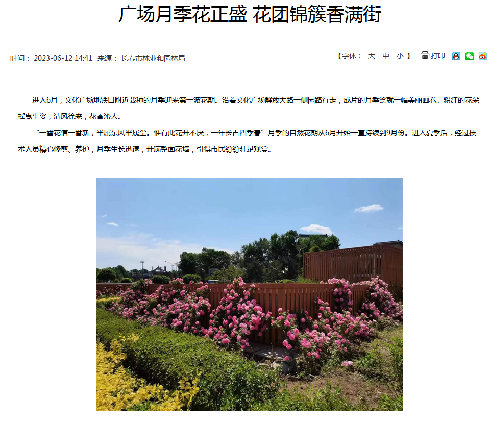 在文化广场地铁口附近栽种的月季迎来第一波花期,沿着文化广场解放大路一侧园路行走,成片的月季绘就一幅美丽画卷。