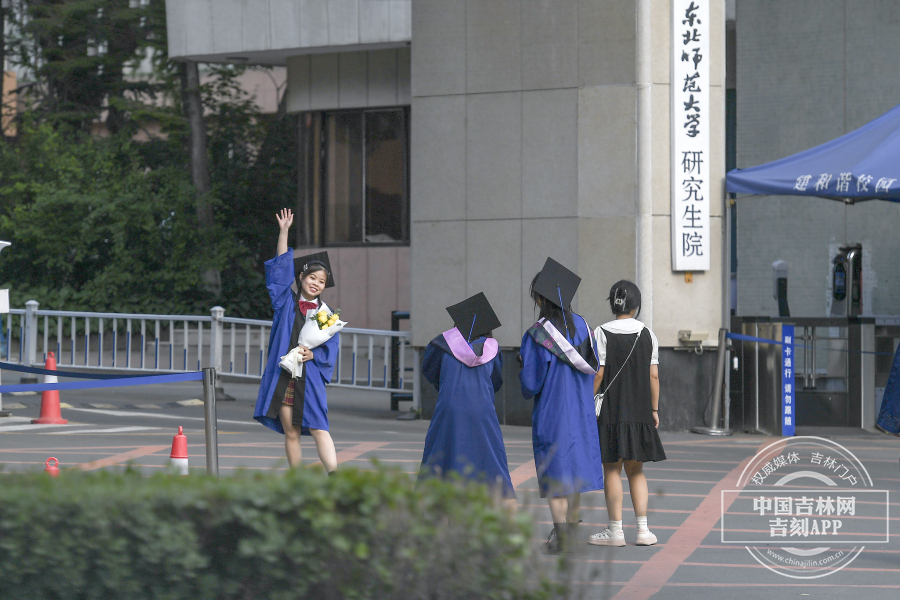 在东北师范大学门前,一位毕业生手捧鲜花拍照留念。