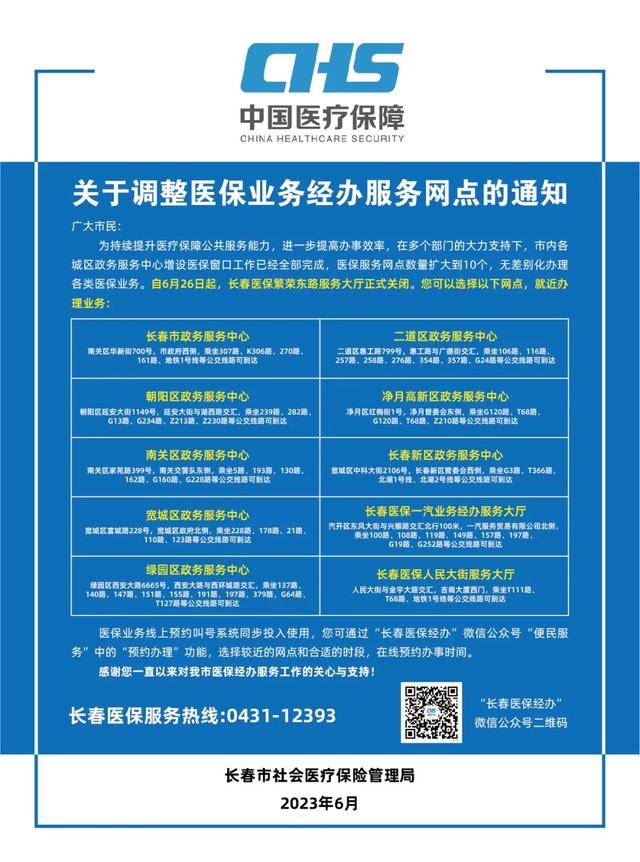 20日,长春医保经办微信发布关于调整医保业务经办服务网点的通知,自6月26日起,长春医保繁荣东路服务大厅正式关闭,您可以选择以下网点,就近办理业务。
