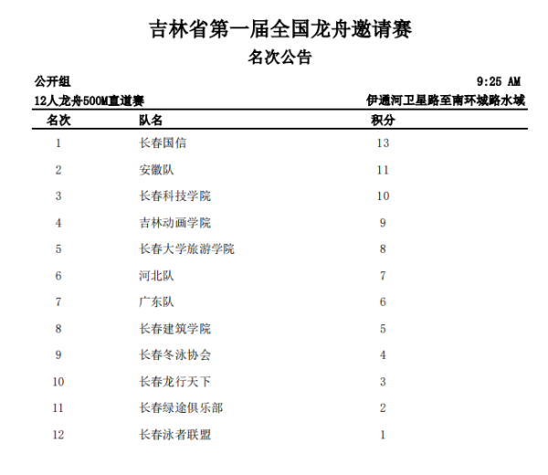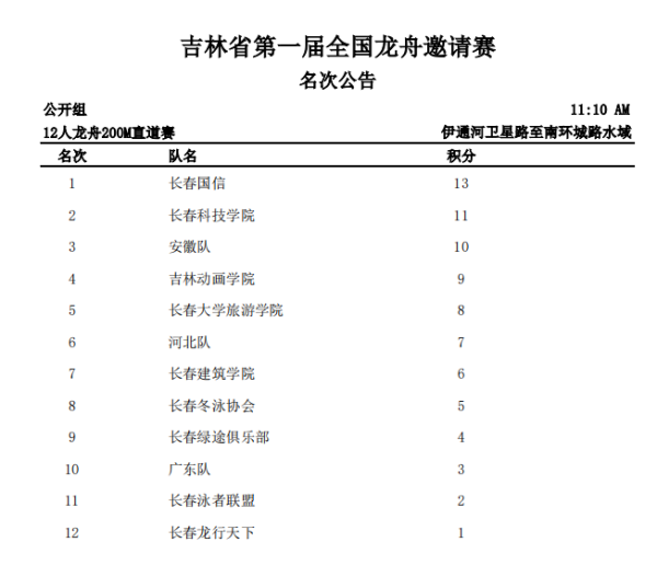 在三项赛事中,长春国信龙舟队获得公开组12人龙舟500米直道赛和12人龙舟200米直道赛两项比赛桂冠,安徽龙舟队和长春科技学院龙舟队同样发挥出色,在这两个项目上分别获得二三名。