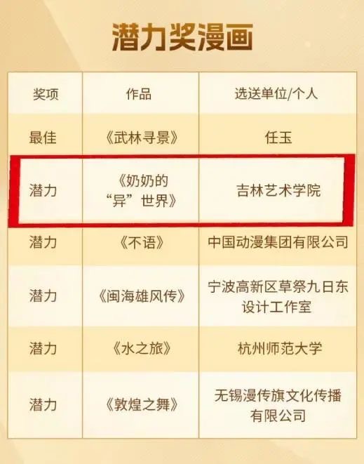 吉林艺术学院此前曾数获“金猴”,从作品《昆虫联盟》获最具潜力动画系列片奖,到作品《北方》获最具潜力动画短片奖;从作品《雀之列车》获入围奖,到《艺考那年》获潜力奖最佳漫画奖;从作品《生生不息》获综合类动画短片奖金奖,到作品《百鸟朝凤》获综合类动画系列片奖金奖,再到本届喜获金猴,再创佳绩。