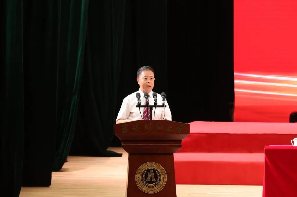 校党委副书记、校长童猛作了热情洋溢的致辞。他首先代表学校向即将毕业的2032届学生表示最热诚的祝福,向辛勤培育毕业生的父母、老师表达最崇高的敬意和最美好的祝福。童猛指出,2023届的毕业生风采卓然、其气自华,集中体现了全体学子在吉财取得的成长和进步;四年来,大家与学校共同经历了振奋人心的时刻;大家与学校也共同经历了艰难困苦的时刻……但终究在风雨之后见到了彩虹;大家与学校更是共同经历了平凡中的不平凡。童猛有感于陶行知先生“千教万教教人求真,千学万学学做真人”的教诲,赠2023届毕业生们一个字——“真”:“真”是真知、是认真、是真诚、是纯真。他希望同学们心向远方、脚踏实地,为国家为社会作出无愧于时代的贡献,实现自己人生的价值。