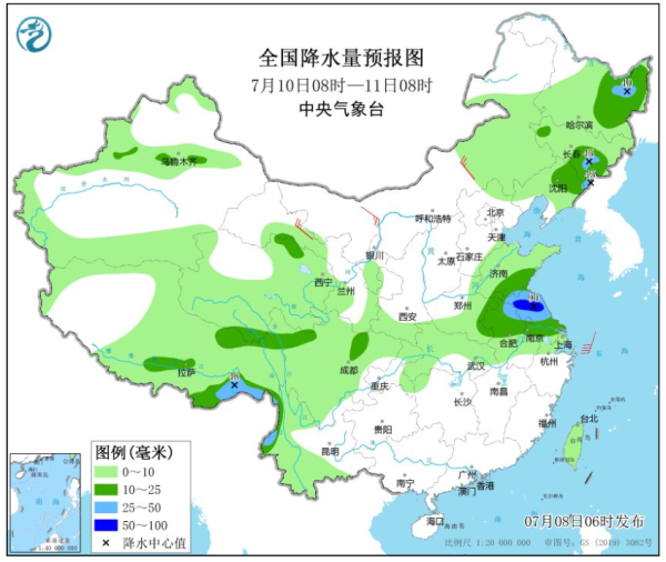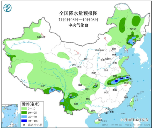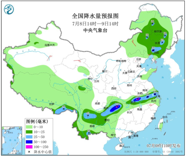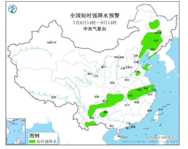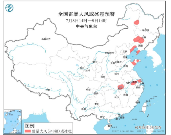 预计7月8日14时至9日14时,内蒙古东部、黑龙江西南部、辽宁西北部和南部、山东东部、安徽中南部、江苏南部、湖北东部等地的部分地区将有8-10级雷暴大风或冰雹天气,局地风力可达11级;内蒙古东部、黑龙江西南部、吉林中西部、辽宁大部、河北东北部、山东中东部和南部、安徽中南部、江苏中南部、上海、湖北东部和西南部、湖南北部、江西北部、浙江北部、四川南部、重庆东南部和中部、贵州北部和西南部、云南东部等地的部分地区将有短时强降水天气,小时雨量30-50毫米,局地可达70毫米以上。